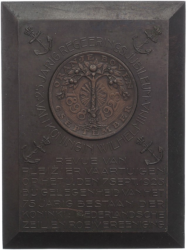 1923 25-Jarig regeringsjubileum Wilhelmina + 75 jaar Koninklijke Nederlandsche Zeil- en Roeivereeniging. In medaillon een vruchtdragende oranjeboom omgeven door vier ankers. / Blanco. Æ rechthoekig 79 x 59. KB II-339. Prachtig.