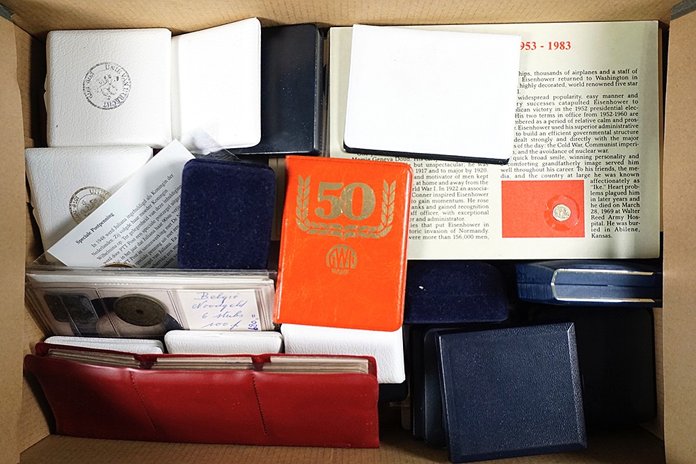 Schoenendoos met penningen, replica’s, ‘nepstuivers’, ook iets zilver en iets buitenland. Zeer divers.