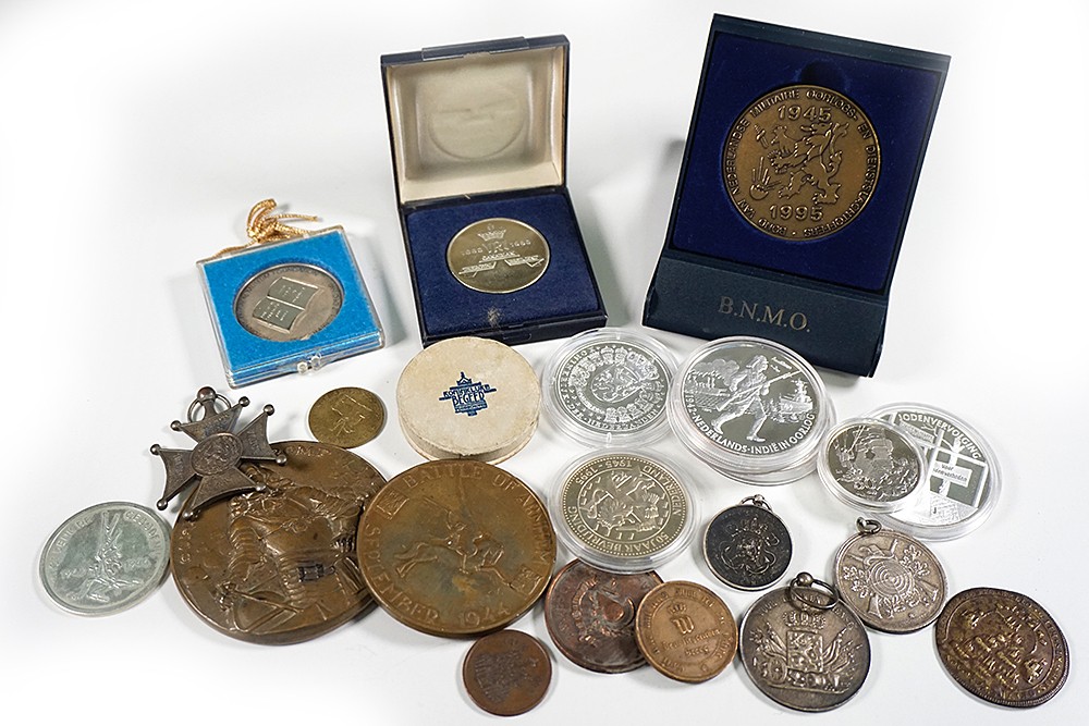 Imitatielederen doosje (23) militariapenningen/penninkjes, w.o. Lombokkruis. Veel zilver.