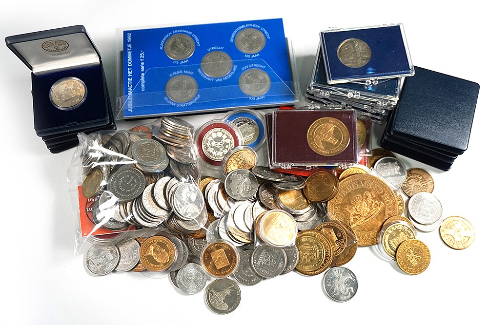 Doos met ca. 3 kg. stedenpenningen, vnl. brons, tombak en kopernikkel, maar ook wat zilver.