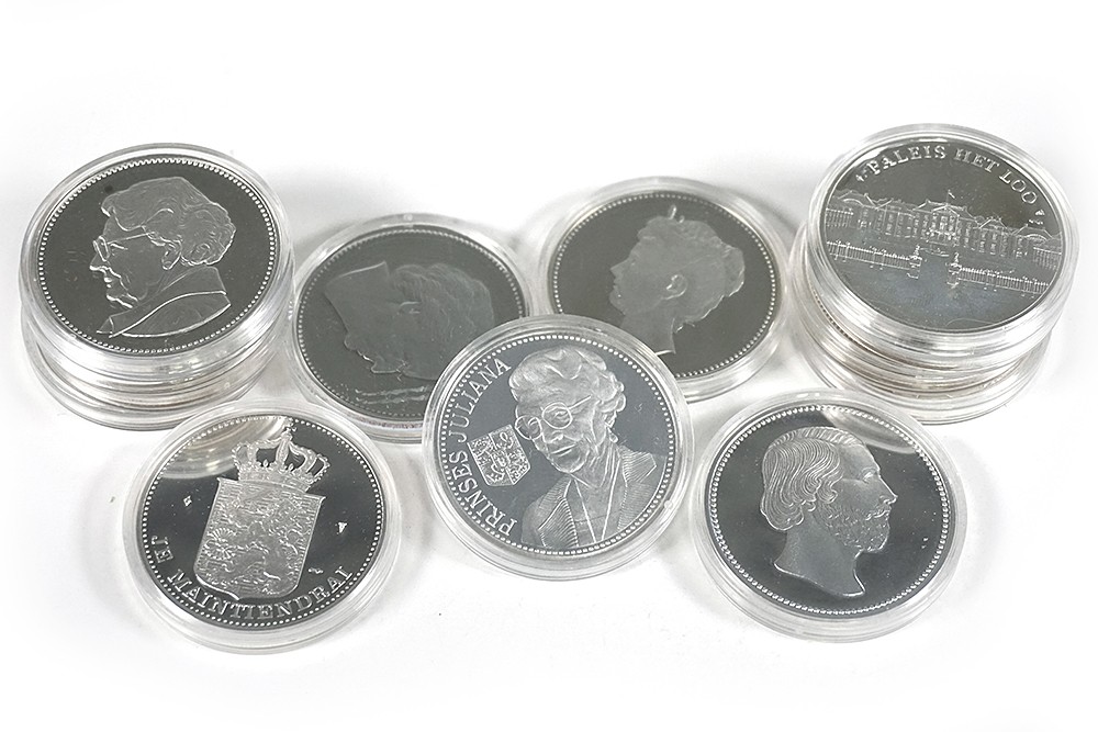 Blikje (13) moderne sterlingzilveren penningen (KNM) laat 20e eeuw. Netto zilver: 300 gram.
