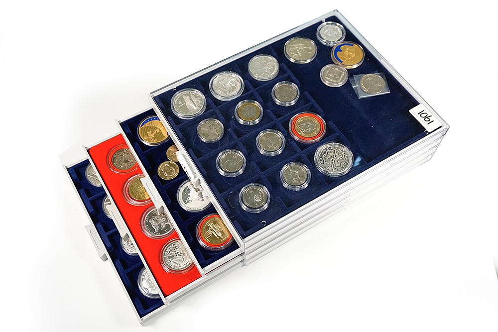 Vier Lindnercassettes moderne penninkjes binnen- en buitenland, o.a. ‘Piratenpeso’s’ van Cuba. Veel zilver.