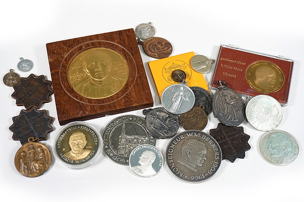 Plastic transparant doosje (22) religieuze penningen/penninkjes. Ook buitenlandse. Enig zilver.