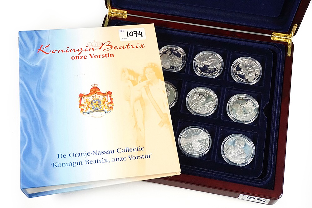 Houten cassette met 36 sterlingzilveren penningen “Koningin Beatrix – onze Vorstin”. Inclusief certificaten. Netto zilver: 832 gram.