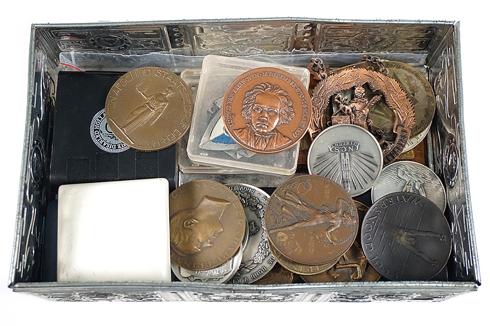 Groot blik met van alles en nog wat penningen, o.a. presse-papier Philips.