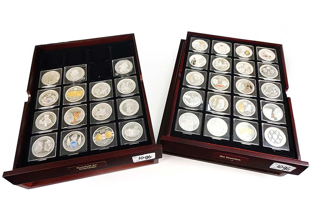 Twee luxe opbergkisten met ruim 50 zilverkleurige penningen m.b.t. ons vorstenhuis en het koninkrijk der Nederlanden.