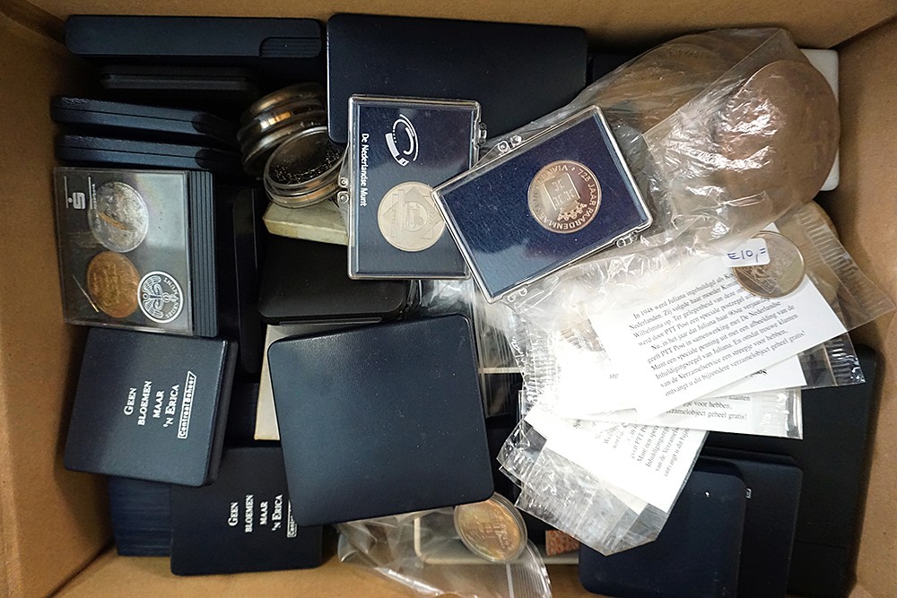 Grote doos vol met allerlei penningen; tokens binnen- en buitenland; stedenpenningen enz., enz. Zeker 200 gram zilver en 6,1 gram goud (netto). Verrassingspakket!