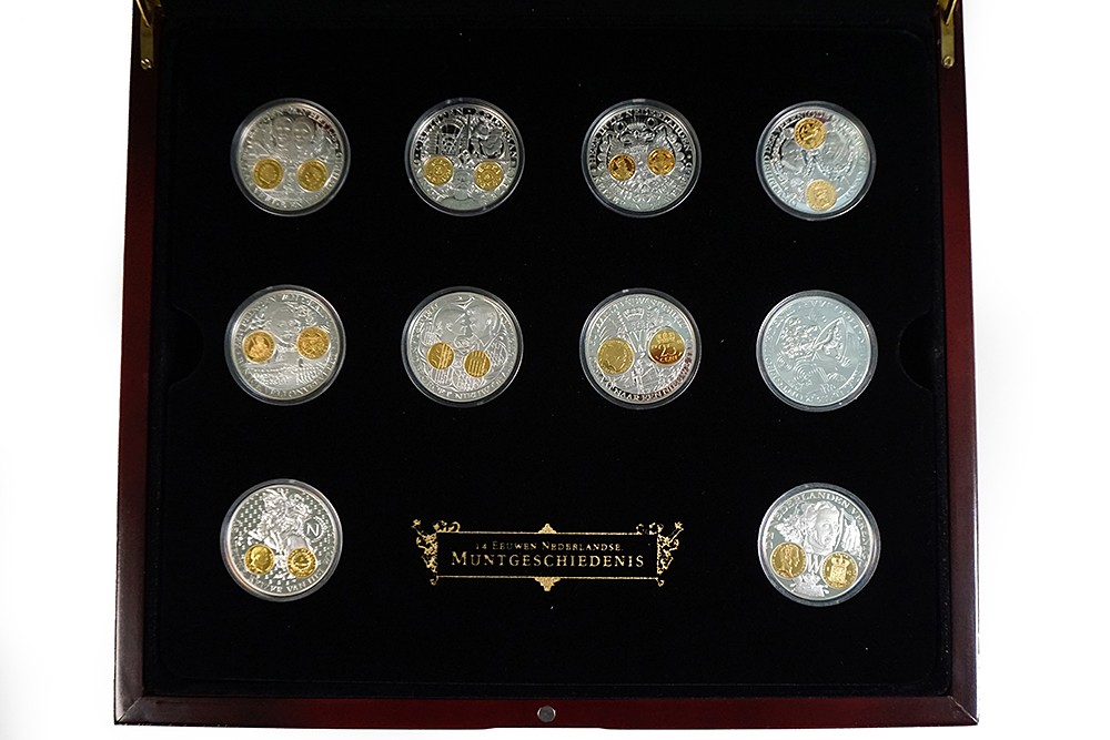 Fraaie kist met 20 stuks zilveren penningen met goud vergulde inlets.