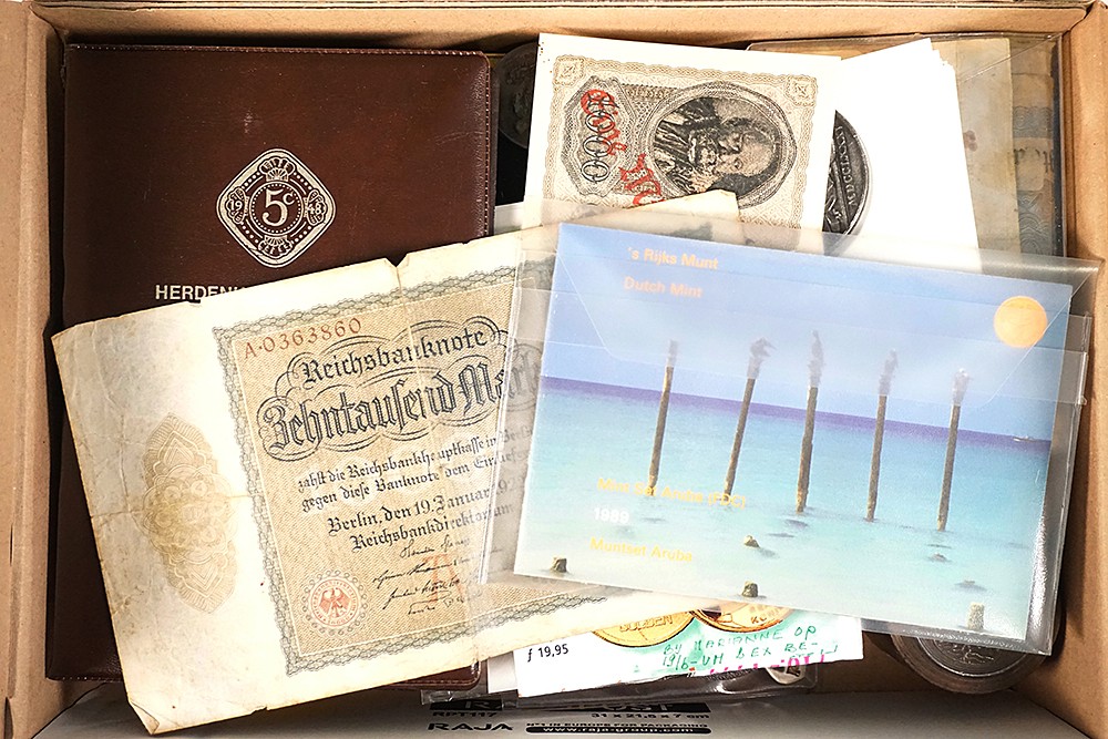 Doos met restcollectie diverse penningen en onderscheidingen. Toegevoegd, stempelponsoen met het wapen van ‘s-Hertogenbosch en iets van bankbiljetten.
