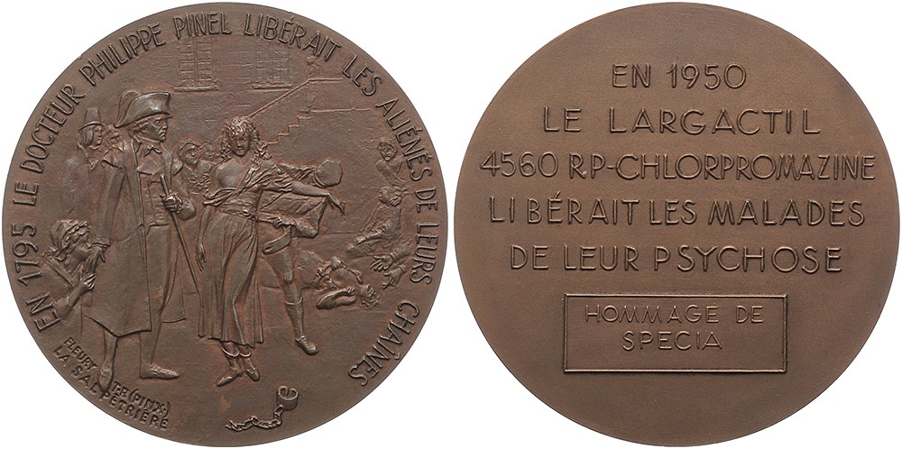 1950 En 1795 Philippe Pinel libérait les aliénés de leurs chaînes. Le docteur debout en libérant les aliénés d’après une peinture de Tony Robert Fleury. / Texte. Æ 67. Superbe.