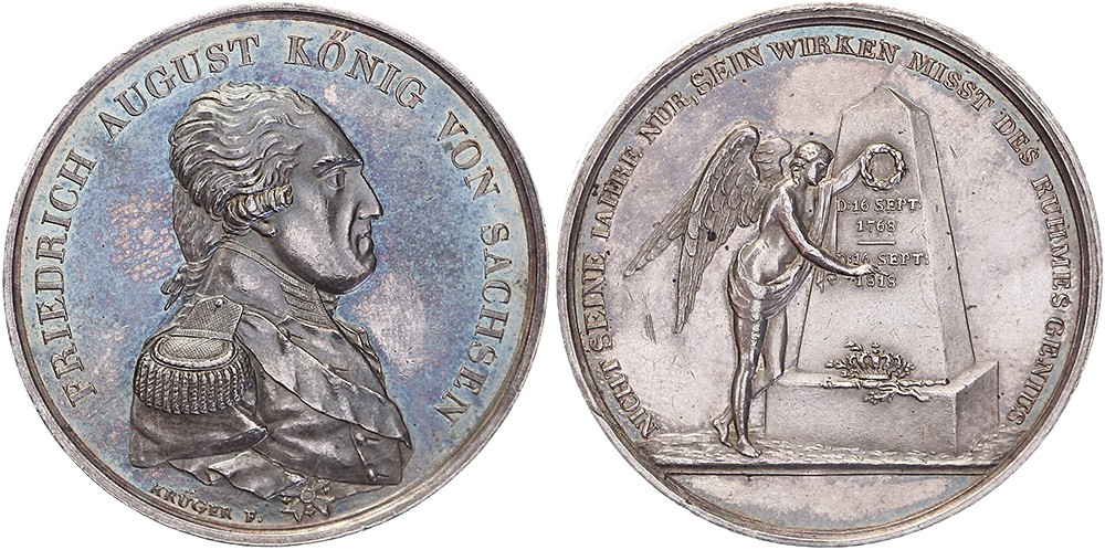 1818 Auf das 50-jähriges Regierungsjubiläum Friedrich August I von Sachsen. Brustbild nach rechts. / Genius mit Kranz neben Obelisk. AR 39,5. Merseb. 2071. C.R. Krüger. Vorzüglich.