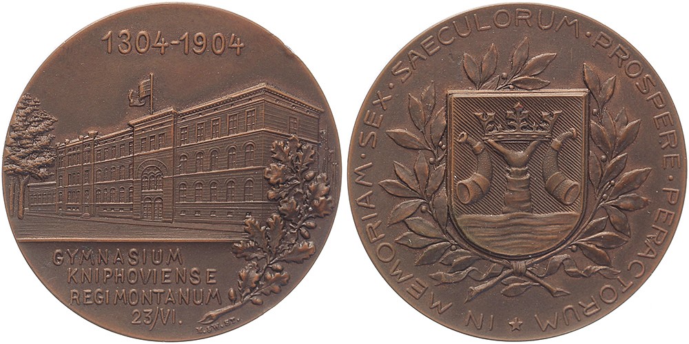 1904 Königsberg, 600 Jahre Kneiphöfische Gymnasium. Gesicht auf das Gymnasium. / Stadtschild zwischen Lorbeerzweigen. Æ 40. Mayer & Wilhelm. Im Originaletui. Fast Stempelglanz.