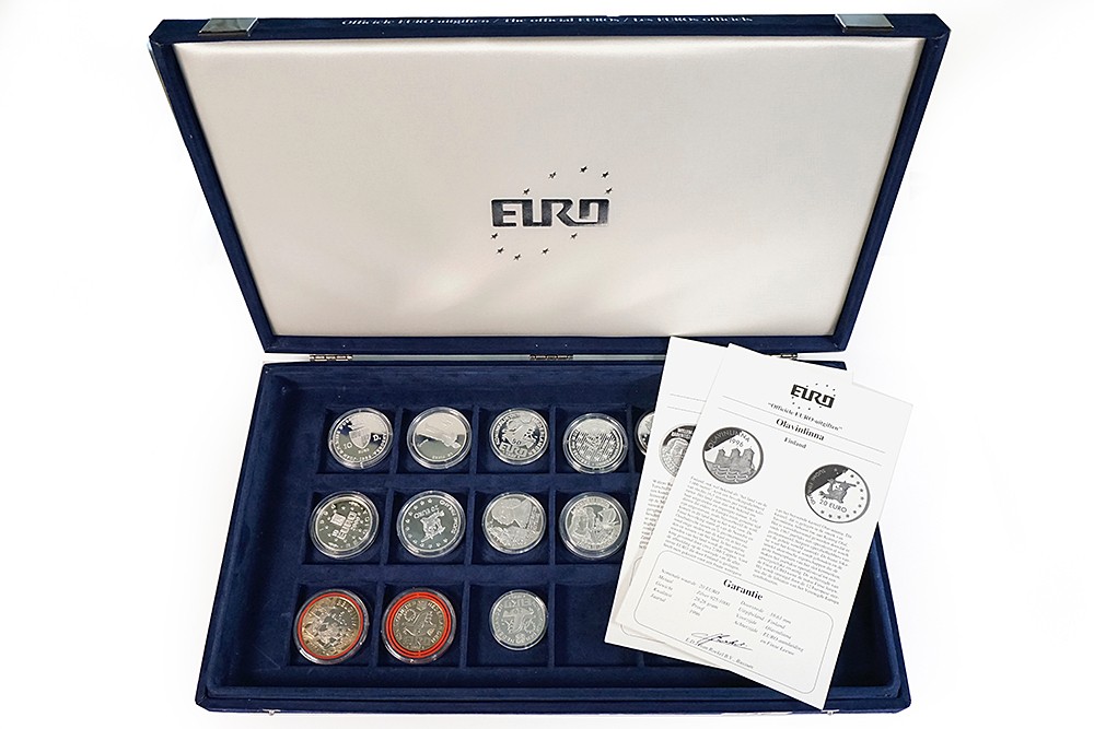 Blauwe cassette met twaalf Europese ‘voorlopers’ van de euro; 2 x kopernikkel en 10 x zilver. Bruto zilver: circa 235 gram.