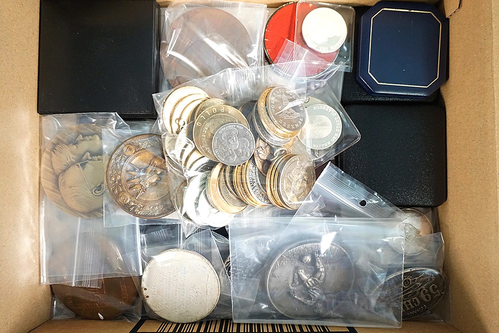 Doos zeer divers (88) uit verschillende landen, iets zilver.