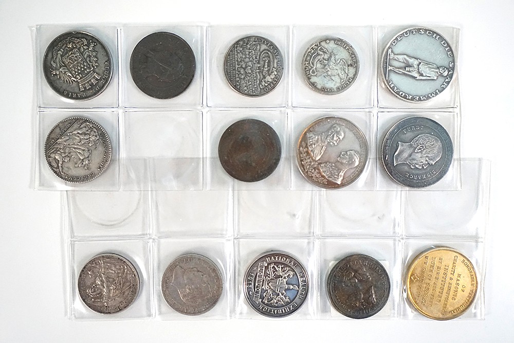 Doosje met 14 stuks onuitgezochte penningen van Duitsland en Engeland. De moeite van het bekijken waard!