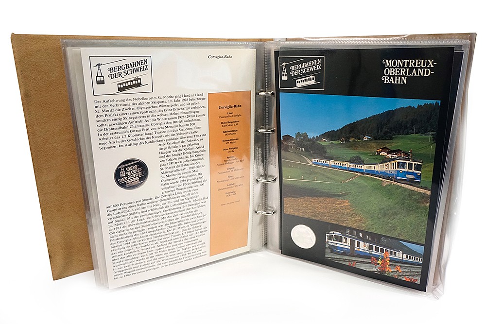 Bruin album “Bergbahnen der Schweiz” met 35 zilveren (999.9/1000) penningen. Beroemde bergtrajecten, w.o. de Rhätische Bahn. Netto zilver: 525 gram.