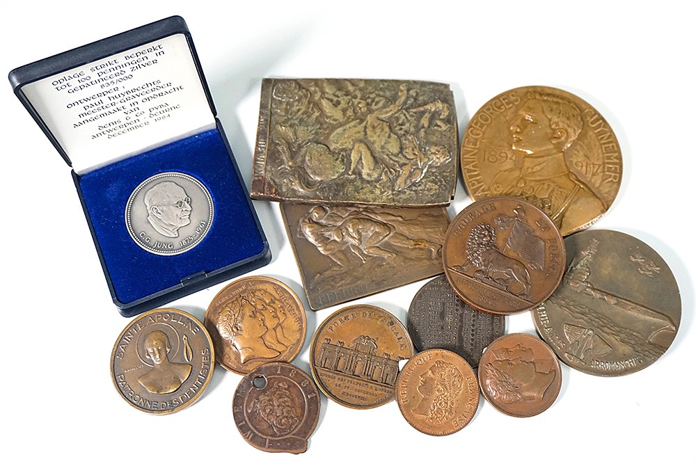 Interessant lot (13) buitenlandse penningen diverse landen, w.o. enkele Napoleoniden, hondenpenning Wenen, ortodontie, art-déco etc. etc.