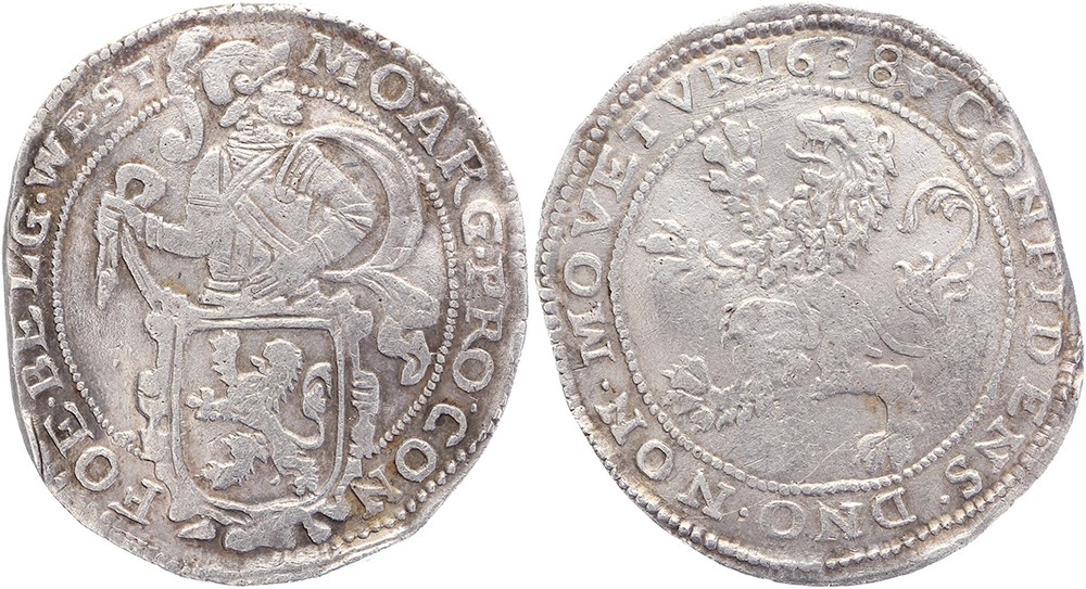 Leeuwendaalder 1638. Delm. 836; CNM 2.46.24; HPM 17. Gesnoeid waardoor het muntplaatje ovaal lijkt. Zeer fraai / prachtig.