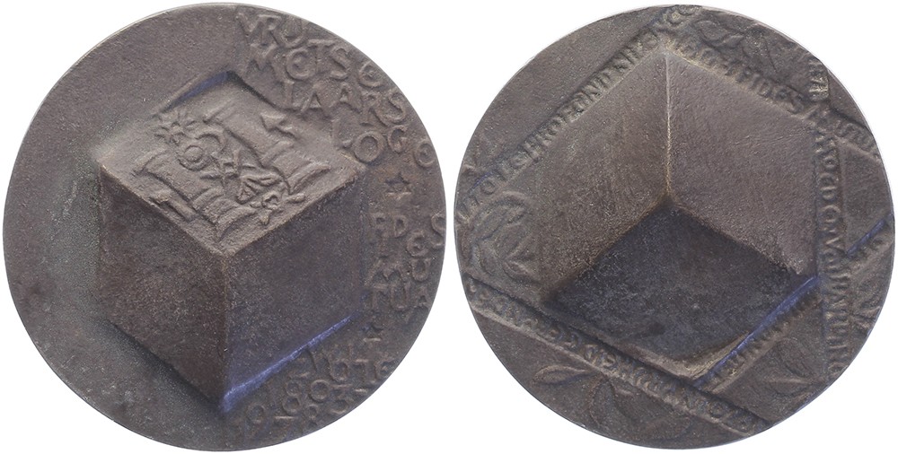 1978 Zwolle, 125 jaar vrijmetselaarsloge ‘Fides Muta’. Kubieke steen met oud zegel. / Blanco keerzijde van de steen. Æ gegoten 61. Beeldenaar 2002, pag. 69, nr. 112. (Eric Claus). Zeer fraai.