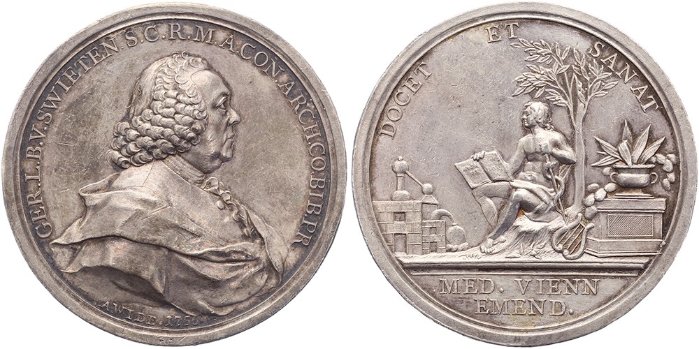 1756 Wenen. Gerard van Swieten, lijfarts Maria Theresia. Borstbeeld naar rechts. / Zittende Apollo met opengeslagen boek bij laboratorium en pot met aloë, DOCET ET SANAT. In afsnede: MED. VIENN EMEND. AR 49 [52,25 gr.]. VvL 338; Brettauer 1193; Freeman 505. A. Wideman. Ruim zeer fraai.