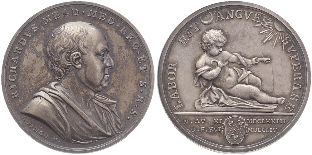 (1775) Richard Mead 1673-1754. Borstbeeld Mead naar rechts. / Zittend kind met slang, LABOR EST ANGVES SVPERARE. AR 40 [20,08 gr.]. Brettauer 757; Eimer (the Pingo Family) 51; Freeman 345 (in Æ). L. Pingo. Patina. Schaars. Prachtig.