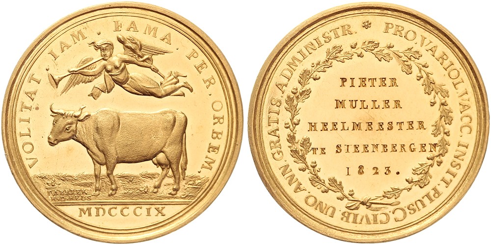 1809 Beloningspenning koepok vaccinaties. Naar links staande koe onder zwevende Genius met trompet en aesculaapstaf. Jaartal in afsnede, VOLITAT IAM FAMA PER ORBEM / Inscriptieruimte binnen gestrikte eikentakken. Op naam van: PIETER MULLER HEELMEESTER TE STEENBERGEN 1823 AU 39,8 [29,21 gr.]. Nahuys I, plaat XII.80; Bramsen 2230; KPK 3883. H. de Heus. Prachtig / FDC. N.B. Onderhandse aankoop munthandel Verschoor, Strijen