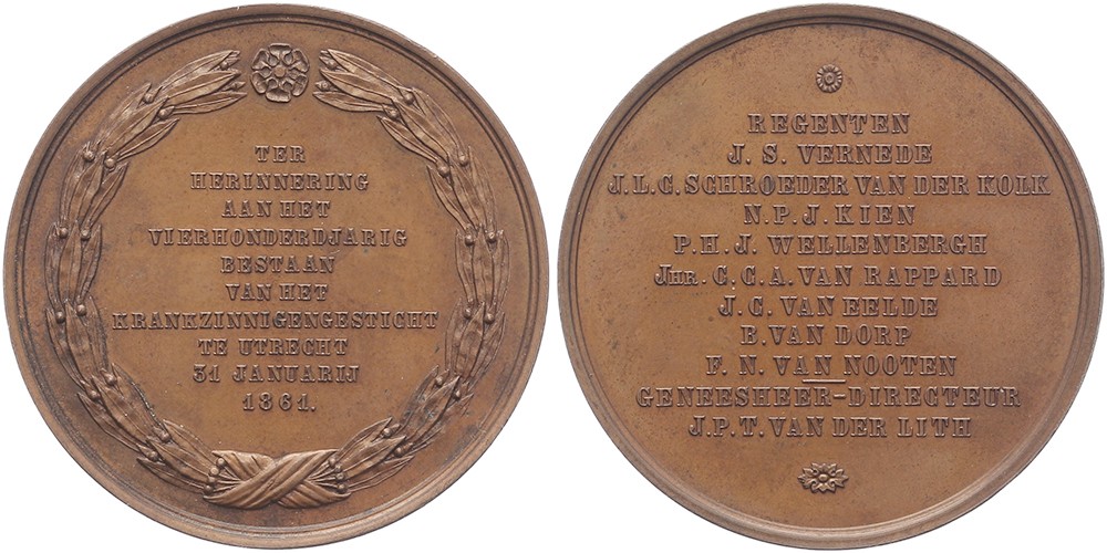1861 Utrecht, 400 jaar krankzinnigengesticht. Vz + kz.: namen acht regenten en geneesheer-directeur. Æ 42. Dirks 841, Brettauer 3019. (D. van der Kellen). Prachtig.