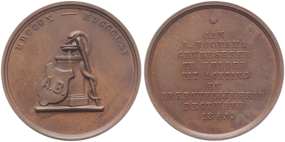 1865 Den Helder. A. Boomsma, geneesheer. Vaas op voetstuk met schild waarop: A.B. / Negenregelig opschrift. Æ 32. Zw. 59; Brettauer 145. (D. van der Kellen). Prachtig.