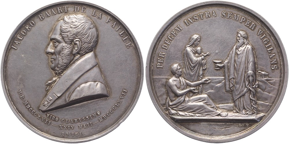 1867 Groningen. Jacob Baart de la Faille 50 jaar medicus. Borstbeeld naar links. / Staande Aesculapis biedt gezondheidsbeker aan zieke mensen. AR 66. JMP 1983, pag. 115, nr. 12; Zw. 90; Brettauer 42; Freeman 13. D. van der Kellen & J.P. Menger. Zeer fraai. N.B. De jubilaris heeft helaas zijn jubileum, op 24 mei 1867, niet meegemaakt. Hij overleed op 19 mei 1867.