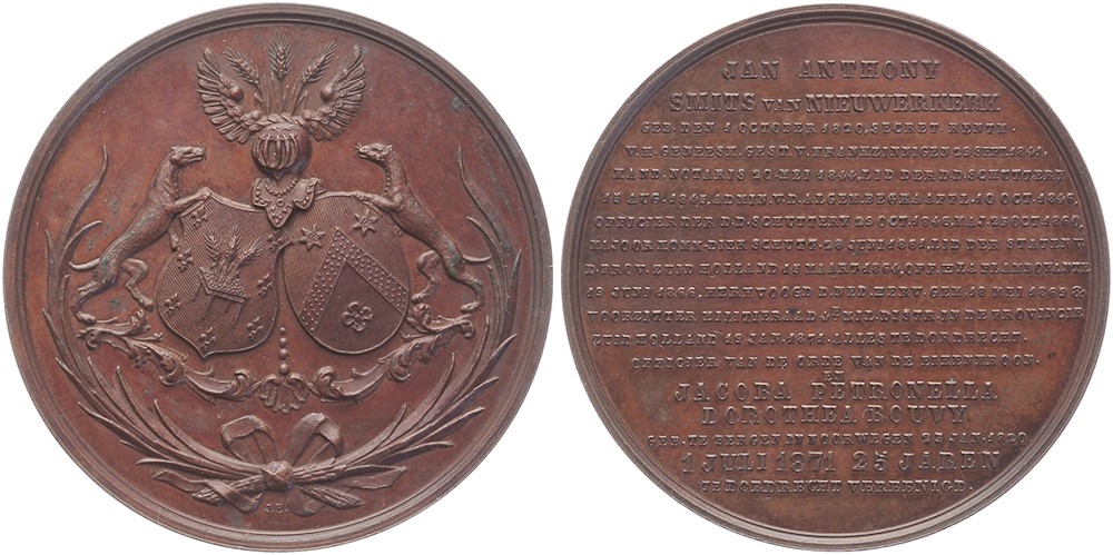 1871 Dordrecht. Zilveren huwelijk J.A. Smits van Nieuwerkerk & J.P.D. Bouvy. Twee gehelmde familiewapens gehouden door twee windhonden. / Achttienregelig opschrift. Æ 42. Zw. 187; Kreeft 54; Brett. 3000. J. Elion. Vrijwel prachtig. N.B. Ex veiling 18 Laurens Schulman, april 1997, kavel 1365