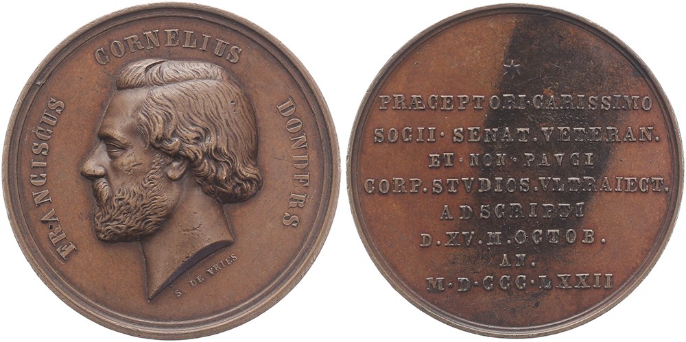 1872 Dr. F.C. Donders 25 jaar hoogleraar te Utrecht. Hoofd Donders naar links. / Achtregelig opschrift. Æ40, Zw. 254; Brettauer 275; Hofstee 57. S. de Vries. Brede zwarte streep keerzijde. Zeer fraai.