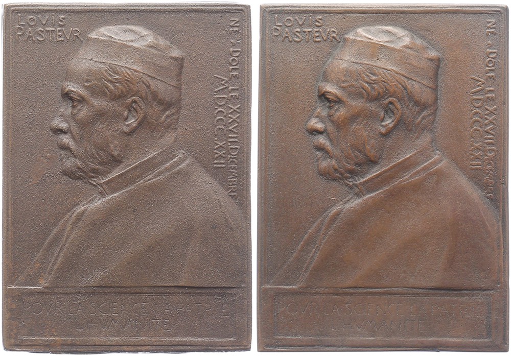 Lot (2) 1892 Louis Pasteur 70 jaar. Borstbeeld naar links. / Tekst. Æ 68 x 49. Brettauer 863. (O. Roty). Zeer fraai. N.B. Eén exemplaar in doosje Corn. Begeer, Oudkerkhof 27, Utrecht