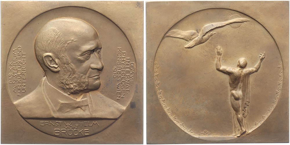 1910 Wien. VIII Internat. Physiologen Kongress. Borstbeeld Ernst Wilhelm von Brücke naar rechts. / Halfnaakte figuur heft de armen naar vliegende adelaar. Æ 66 x 66. Freeman 761. P. Breithut. Vlekje voorzijde. Zeer fraai.