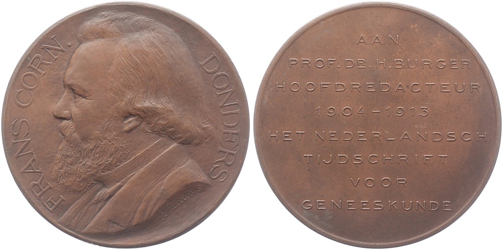 1913 Aan prof. Dr. H. Burger, hoofdredacteur Nederlandsch Tijdschrift voor Geneeskunde. Borstbeeld Frans Cornelis Donders naar links. / Achtregelig opschrift. Æ 59. Hofstee (Utr.) 60. Pier Pander. Prachtig.