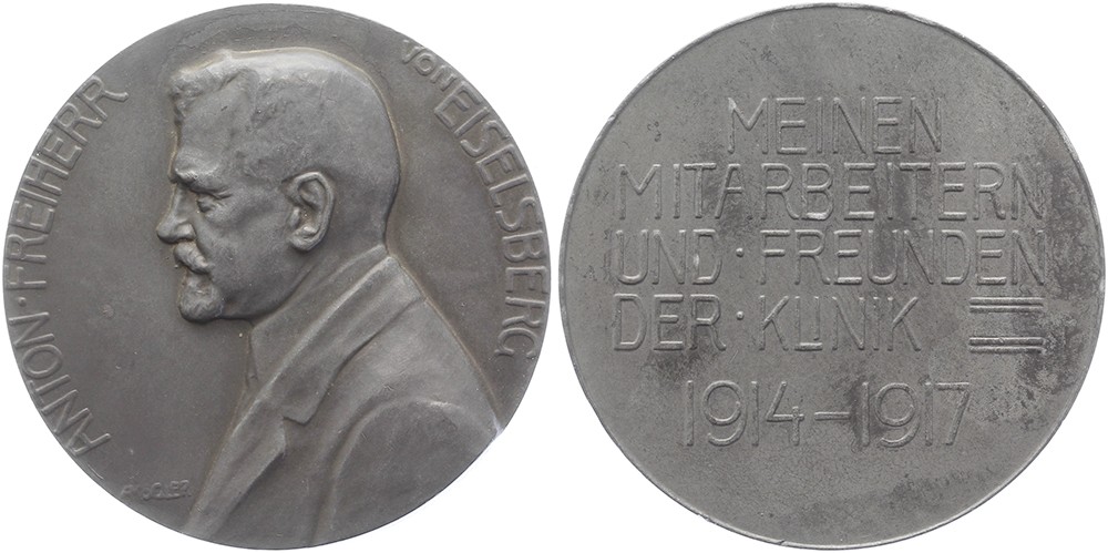 1917 Koningsbergen. Anton, Freiherr von Eiselsberg. Borstbeeld naar links. / Vijfregelig opschrift: MEINEN MITARBEITERIN UND FREUNDEN DER KLINIK 1914-1917 Oorlogsmetaal 65,5. Hofstee (Utr.) 62. A. Kogler. Schaars. Zeer fraai.