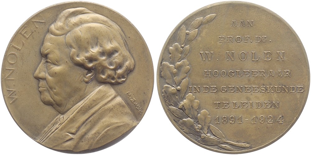 1924 Leiden. Emeritaat prof. Willem Nolen. Borstbeeld naar links. / Zevenregelig opschrift. Æ 40. Hofstee 66. Marinus Zwollo. Schaars. Zeer fraai / prachtig.