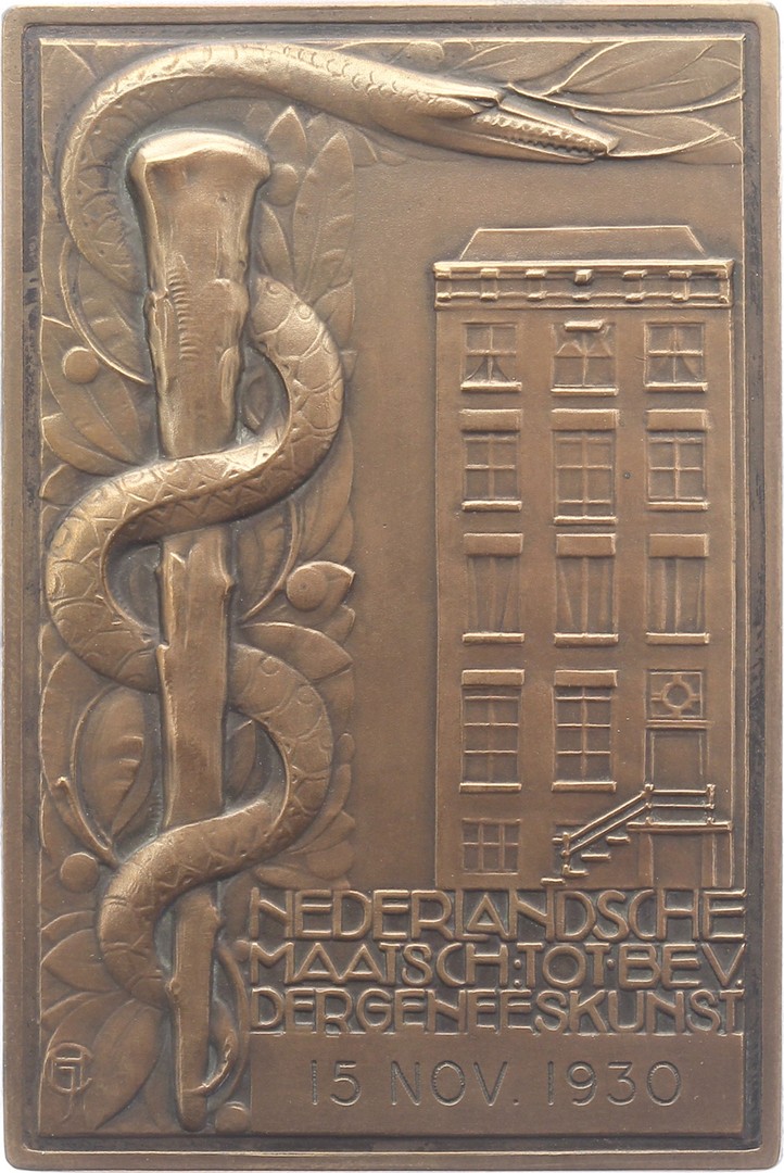 (1930) Amsterdam. Prijspenning Nederlandsche Mij. tot Bevordering der Geneeskunst. Op lauwerbladeren rustende aesculaapstaf naast grachtenpand. / Blanco. Æ 76 x 51. KB III-433; JP 234. C.J. van der Hoef. Prachtig. N.B. De gravering ’15 NOV. 1930’ heeft betrekking op de verhuizing van de Mij.