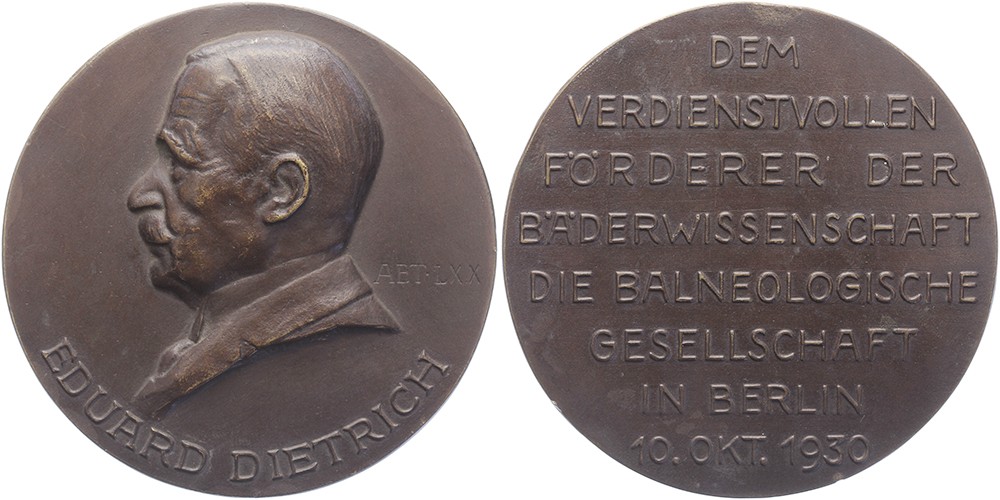 1930 Berlin. Eduard Dietrich, Förderer der Bäderwissenschaft. Borstbeeld naar links op 70-jarige leeftijd. / Tekst. Æ gegoten 80. Dautert. Flauw deukje rand keerzijde. Zeer fraai / prachtig.