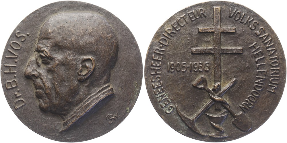 1936 Hellendoorn. Dr. B. Vos, geneesheer-directeur volkssanatorium, bij zijn afscheid. Hoofd van Vos naar links. / Lotharings kruis boven vijzel, gekruiste schop en houweel en aesculaap. Æ gegoten 98. Polak 84. J.G. Wertheim. Prachtig.