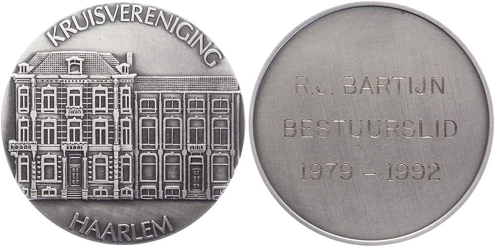 (± 1985) Haarlem. Erepenning kruisvereniging. Gezicht op het hoofdkantoor. / Inscriptieruimte. Op naam van: R.J. BARTIJN BESTUURSLID 1992. Æ verzilverd 50. FDC.
