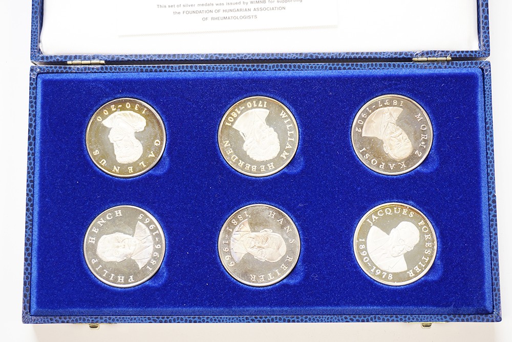 1991 Budapest. XII th European Congress of Rheumatology. 30th june-6th july. 6 Zilveren penningen (AR 43) Galenus 130-200. William Heberden 1710-801 Moriz Kaposi 1837-1902; Philip Hench 1896-1965; Hans Reiter 1881-1969 en Jacques Forestier 1890-1973. Proof in cassette.