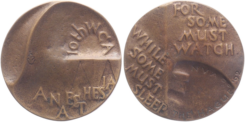 1992 Den Haag, 10th World Congress Anaesthesie. Gestileerde voorstelling toestand narcose. / Diverse opschriften, FOR SOME MUST WATCH WHILE SOME MUST SLEEP Æ gegoten 58,8. (Marianne Letterie). Prachtig.