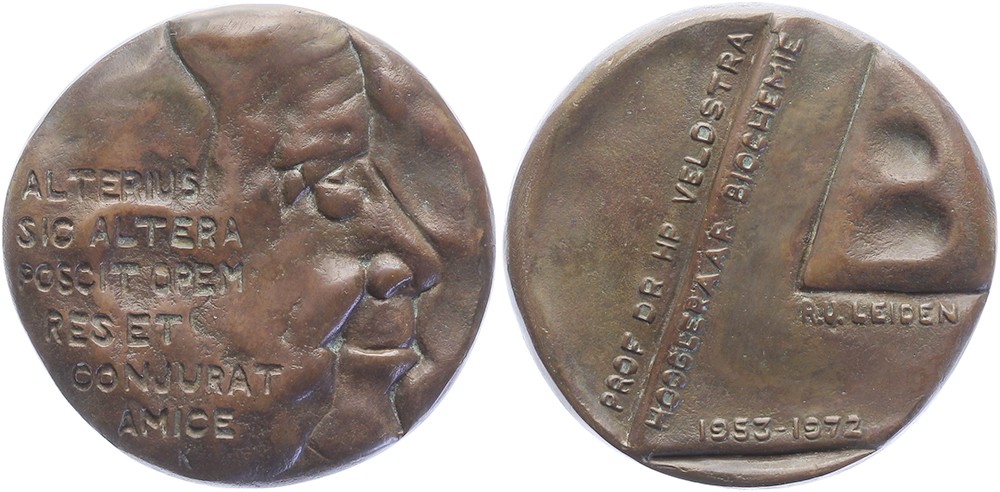 (1993) Prof. Dr. H.P. Veldstra, hoogleraar biochemie 1953-1972 (erepenning vakgroep biochemie Rijksuniversiteit Leiden). Hoofd en profil naar rechts met zesregelig opschrift. / Tekst + logo. Æ gegoten 71. Muntkoerier, januari 1994, pag. 16. J.P. Kruimel. Prachtig.