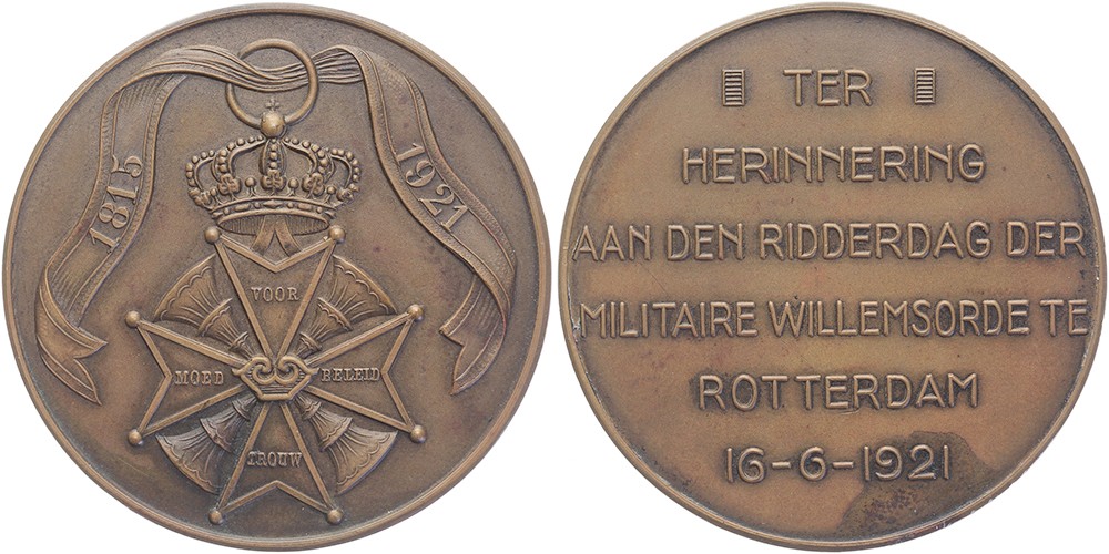 1921 Rotterdam. Ridderdag der militaire Willemsorde. De M.W.O. met lint waarop: 1815 – 1921. / Zesregelig opschrift. Æ 50,5. JMP 1932, pag. 6, nr. 4; KB II-140. (D. Scholtus). Vlek kz. Prachtig.