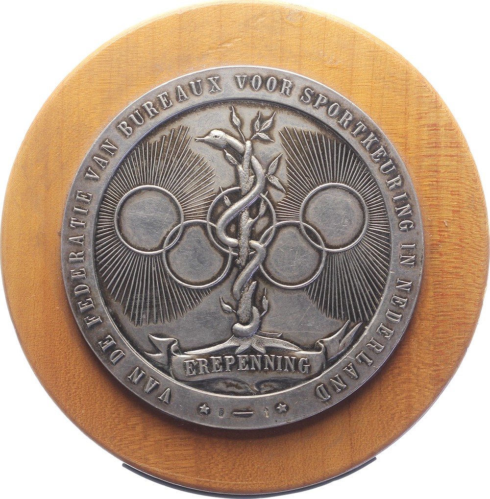 (± 1940) Erepenning Federatie van Bureaux voor Sportkeuring in Nederland. Slang gekronkeld om boompje. Op de achtergrond vijf Olympische ringen; de buitenste ringen stralend. / Blanco. AR 79,7 gemonteerd op ronde houten presse-papier van 103,5 mm. Op naam van: PROF. DR. J.G. SLEESWIJK 1961. Prachtig.