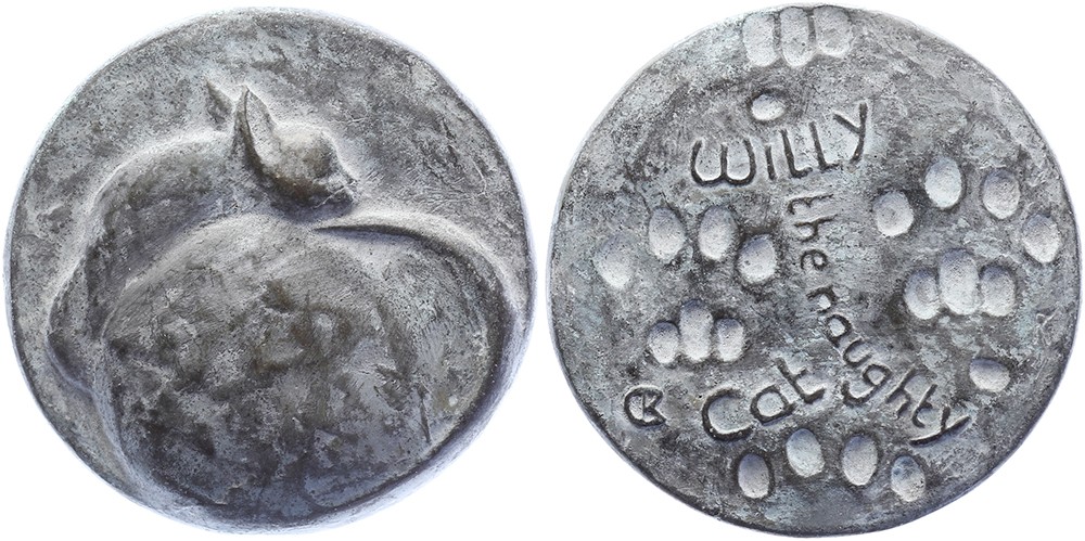(1984) Willy the naughty cat. Slapende ‘opgerolde’ kat. / Afdrukken van poezenvoetjes. Æ gegoten 60,5. Tilanus pag. 431-433. Carla Klein. Prachtig.