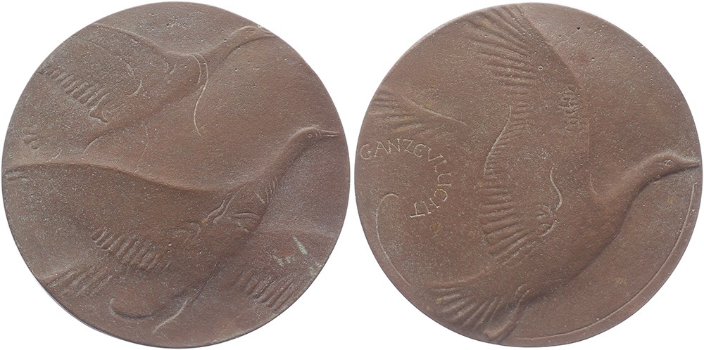 (1985) Niels Holgersson. Naar rechts vliegende gans. / Twee vliegende ganzen. Æ gegoten 86. Tilanus pag. 439-441. (Marianne Letterie). Prachtig.