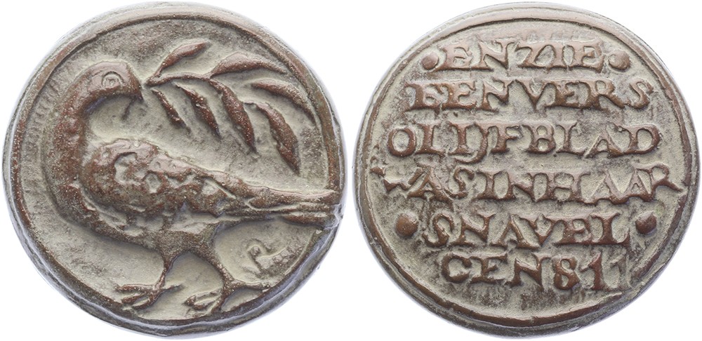 (1986) Duifje van Noach. Duif met vredestak. / Zesregelig opschrift. Æ gegoten 42. Tilanus pag. 443-445. (Ruth Brouwer). Prachtig.