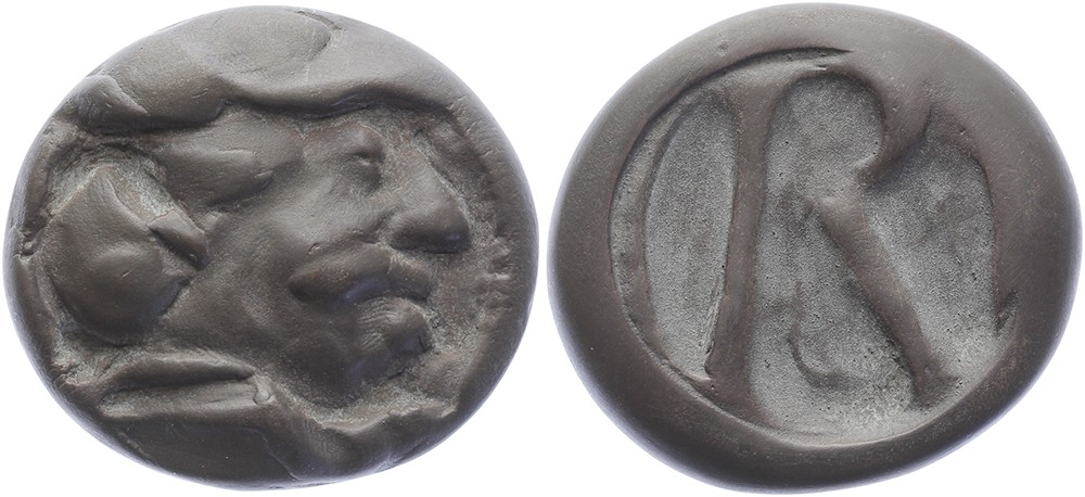 (1988) De jonge Rembrandt. Hoofd Rembrandt naar rechts. / Grote vlakvullende letter ‘R’. Æ gegoten ± 58 x 65. Tilanus pag. 467-469. (V.P.S. Esser). Prachtig.