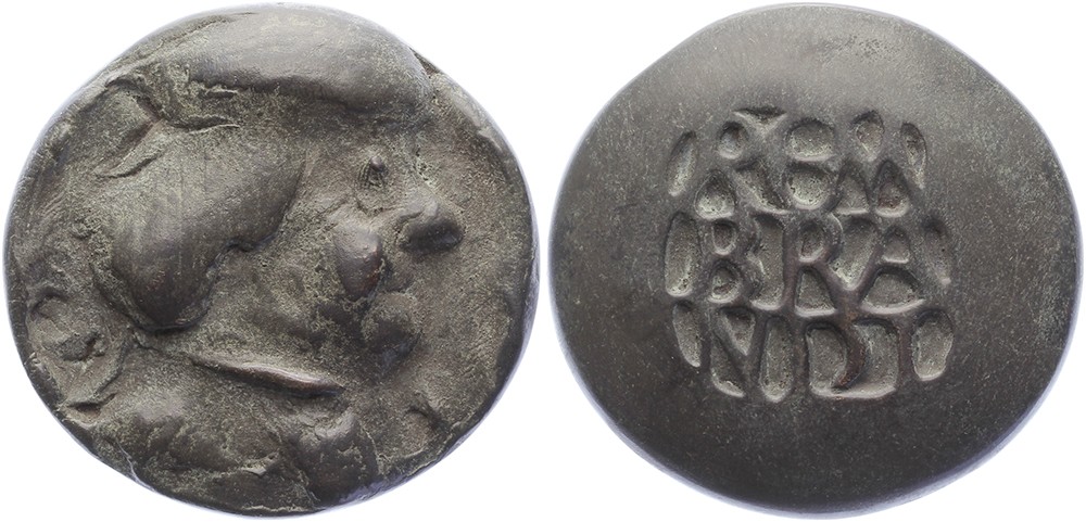 (1988) De oude Rembrandt. Hoofd Rembrandt naar rechts. / Naam, verdeeld over drie regels. Æ gegoten 71-74. Tilanus pag. 471-473. (V.P.S. Esser). Prachtig.